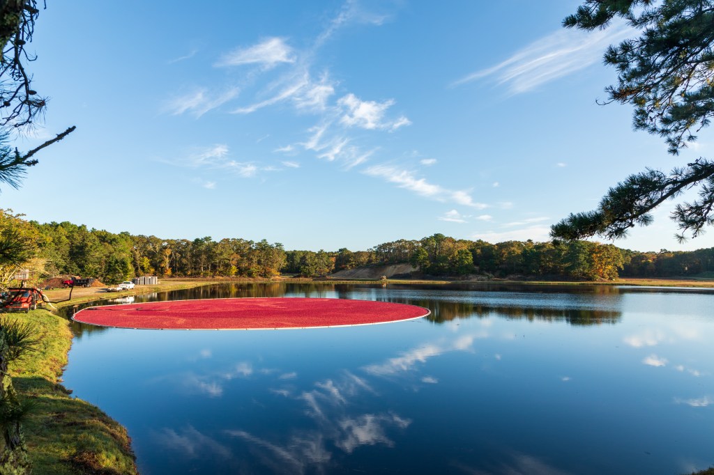 There are over 14,000 acres of cranberry bogs in Southeastern Massachusetts. Natural bogs developed from glacial kettle holes, but most modern farmed bogs are man-made. During harvest, the bog is flooded with around 18″ of water, and then a special machine with a wide reel (similar to a grain head on a combine) is used to wack the cranberry vines. The cranberries pop off the vine and then float to the surface to be collected.