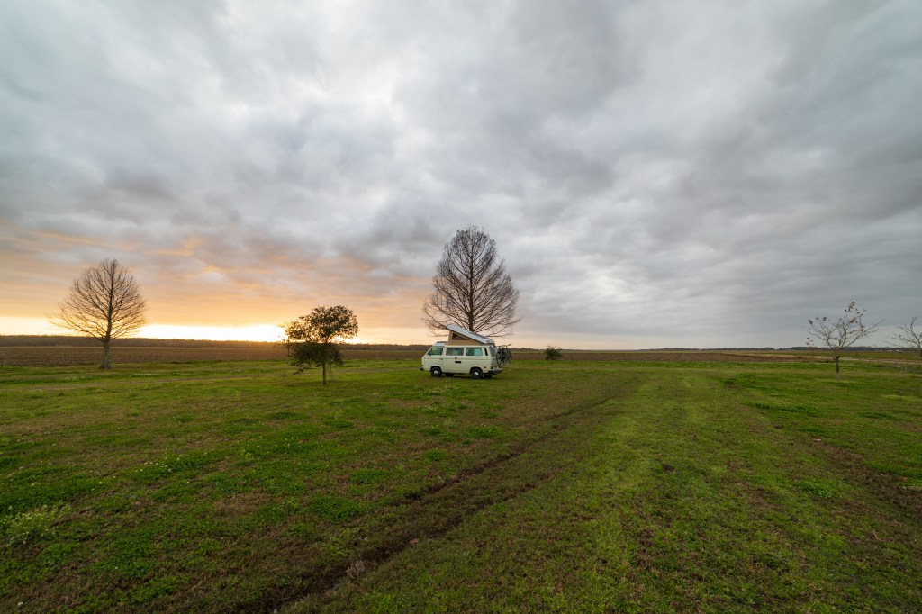 We arrived at our destination and were the only ones there. The campground was just a little patch of grass between the sugarcane fields and the bayou, but it was just what we were looking for.