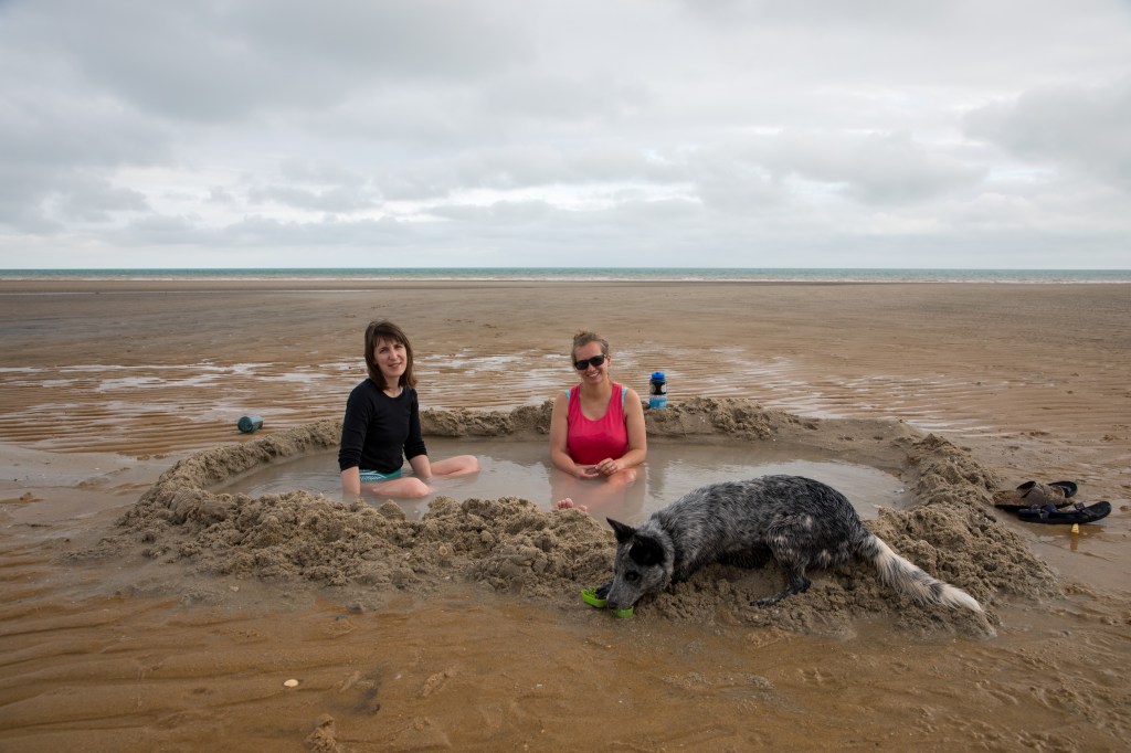Not far up the beach from our campsite was a natural hot spring. It emerged from the sand, and was only accessible at low tide. We found it and walled it off to make ourselves a little hot tub. Kira the dog came and joined us. She mostly wanted to play fetch with a little green shovel and chase the birds. She was very friendly and smart.