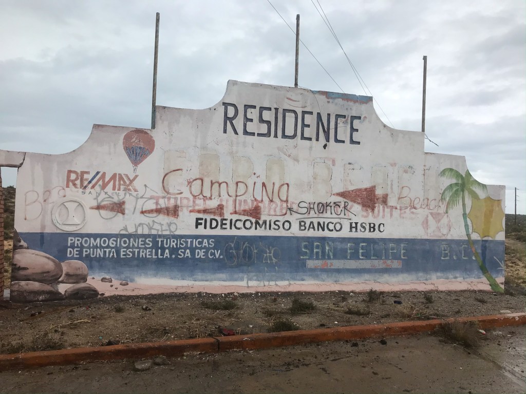 We drove South out of San Felipe and then saw this sign of an abandoned beach community with “camping” spray painted on it. Seems legit.
