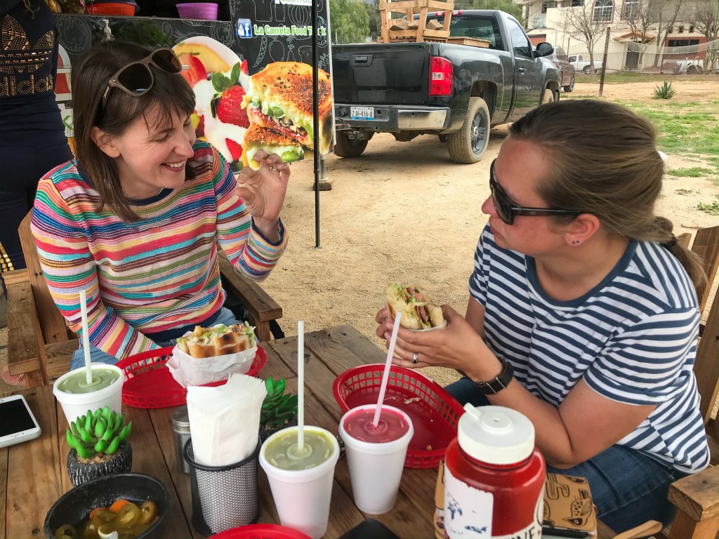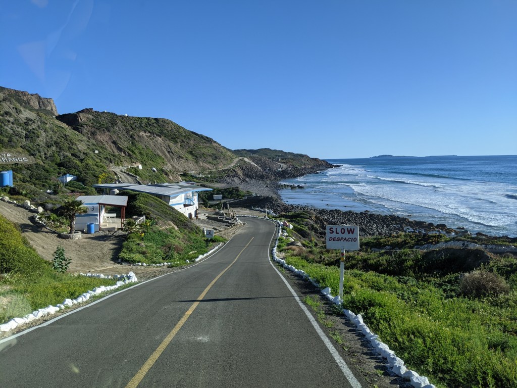 In the morning, we drove to the Tecate border crossing and were over the border in seconds. There were no signs (in English or Spanish) saying we needed to stop and check in at a building, but we knew we needed to get our tourist visas approved somewhere. The Mexican attendant made small talk as he stamped our passports and tried to sell us hot sauce and honey.