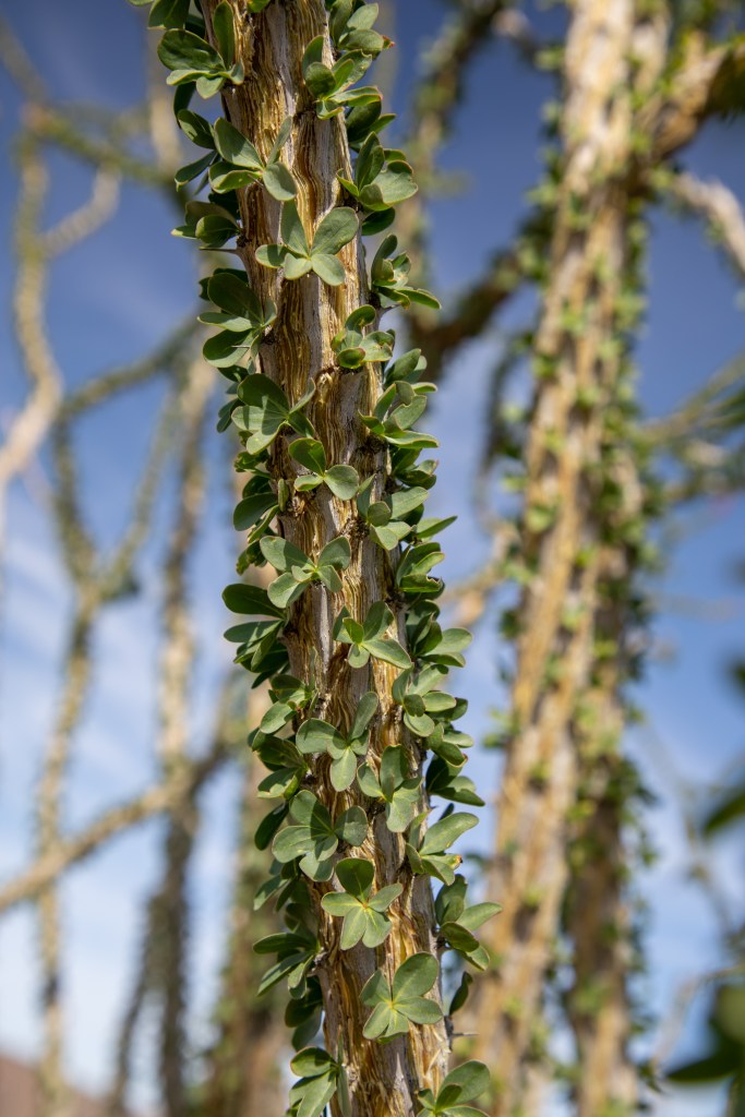 Ocotillo can grow and drop leaves several times a year – it all just depends on water. They were leafing out when we visited Joshua Tree.