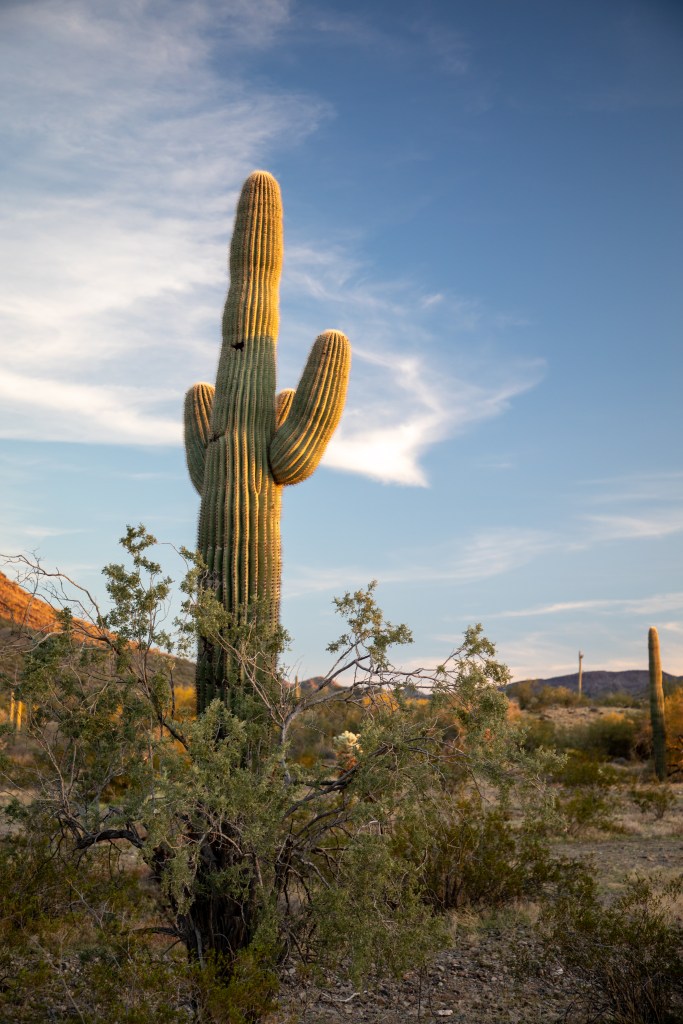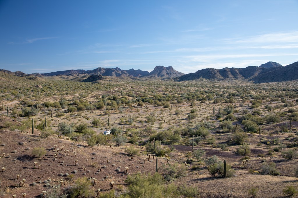 After Phoenix, we headed West a short distance to spend a night on BLM land in the Sonoran desert. Flowers were starting to bloom, wildlife was coming out, and we had a lovely sunset. There was no one else in sight, making it a pretty sweet spot. At night, we heard both Great Horned Owls and Screech Owls – confirming this desert is very much alive.
