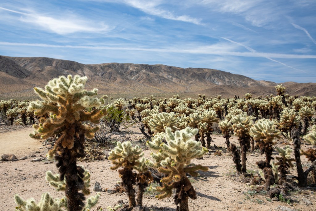 Being California, there were lots of signs warning you that cacti are sharp and pokey. There was even a spine removal kit stationed at the front of the trail into this Cholla Cactus forest.