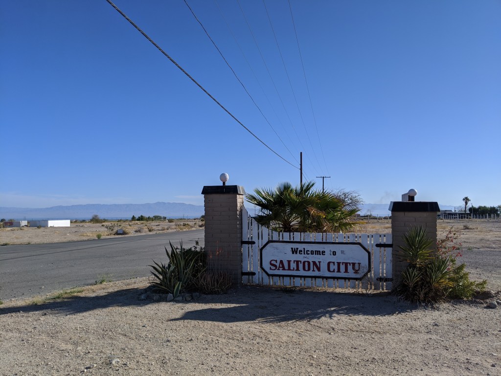 On the Western side of the Salton Sea is Salton City, a failed attempt at developing the region into a massive resort town. Originally designed and plotted for 40,000 people, the town has roads, street signs, water, and electricity run to thousands of lots – but few actual houses. Of those, many are abandoned. We drove into the deserted city, into an abandoned RV park, and out onto the beach of the Salton Sea.