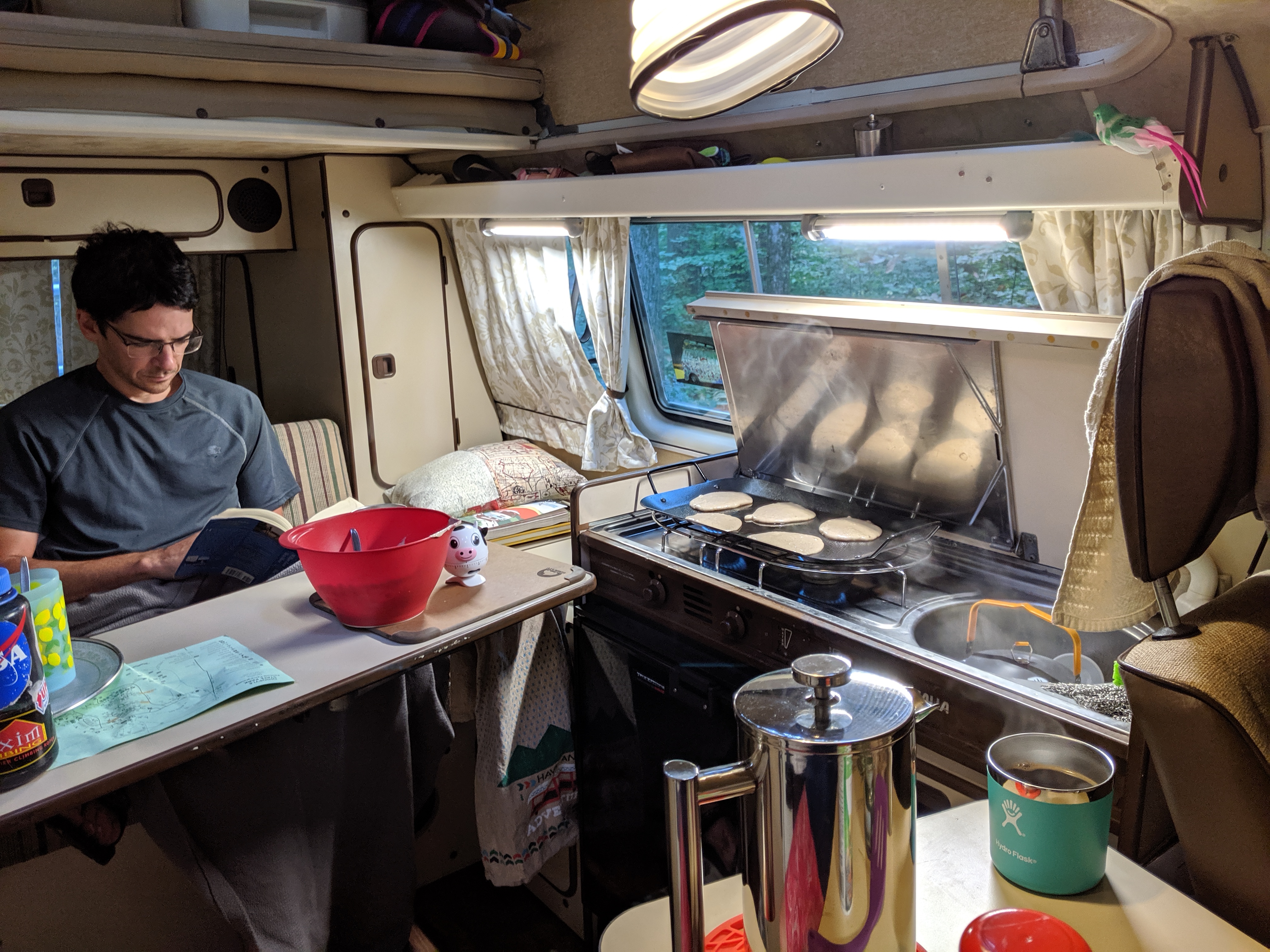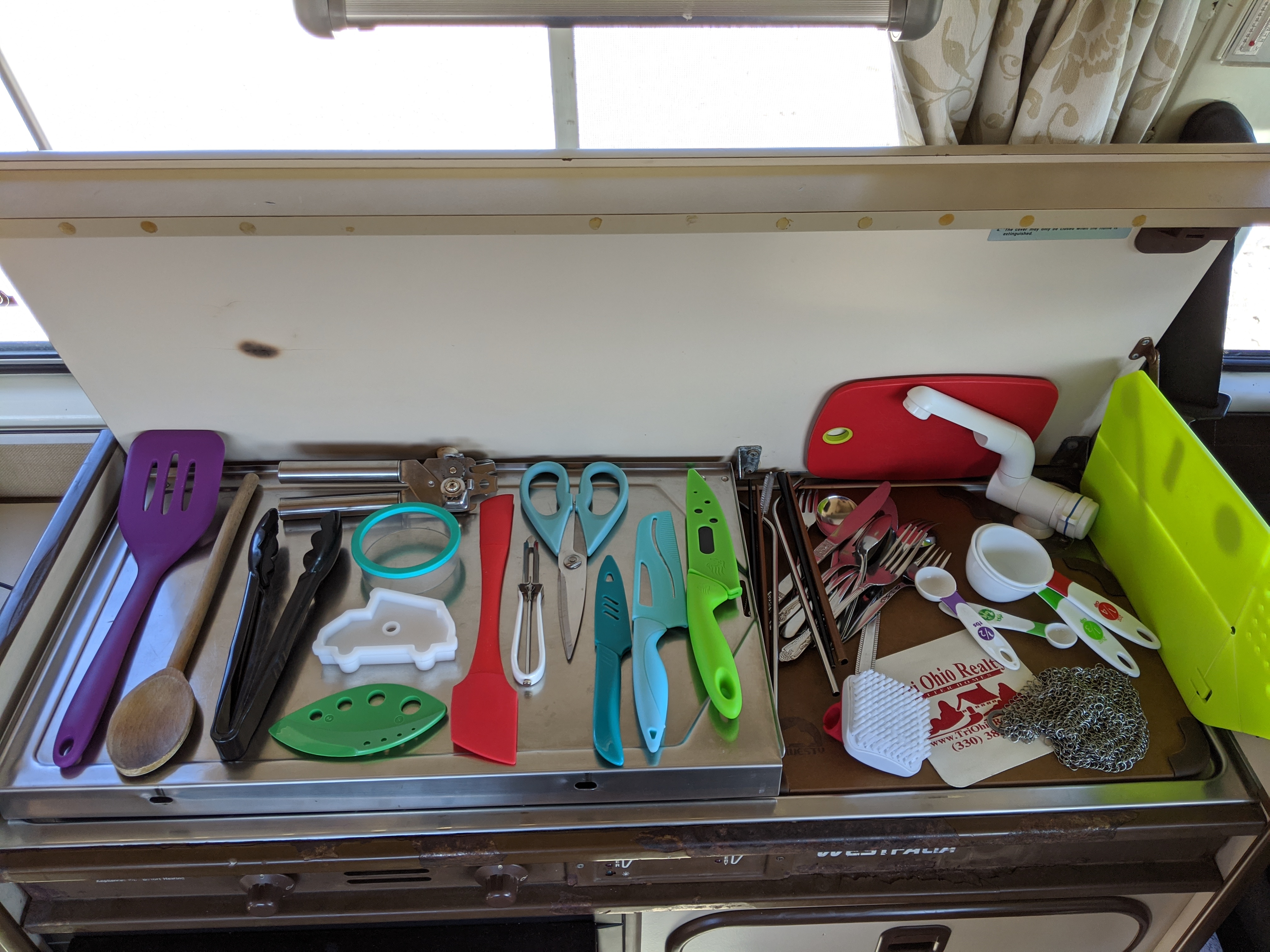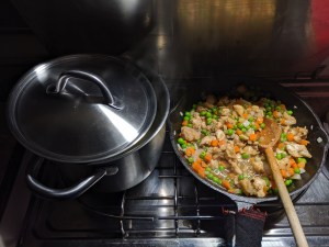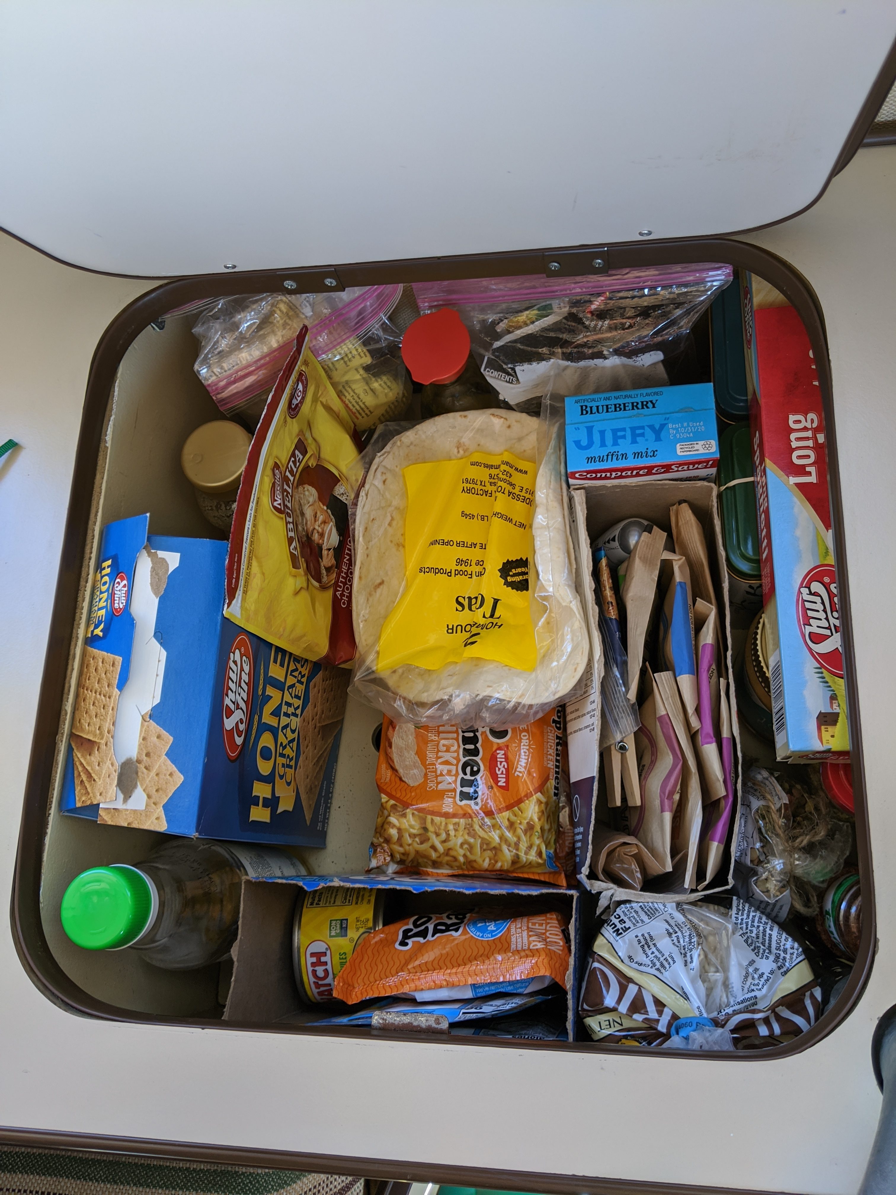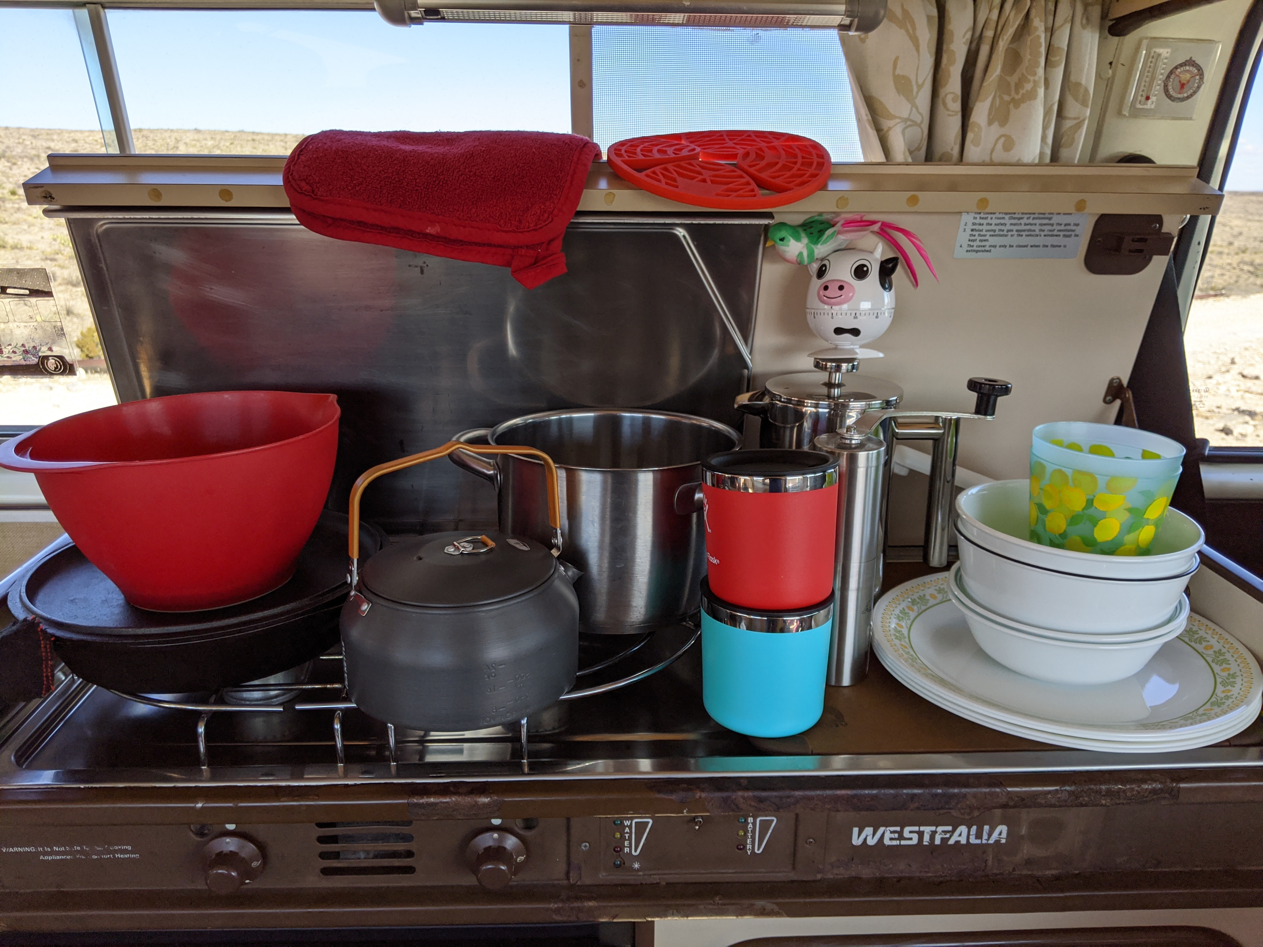 However, this reduction in space has increased my kitchen creativity, even though I do miss the vast counter spaces. Below is a list of recipes that I have been using and trying out on my two burners. I have about two cubic feet of ingredient space and a stock of recipes on my phone. I spent some time going through all of my beloved recipe books (currently packed in Box 50) and found ones that were simple and didn’t require an oven.