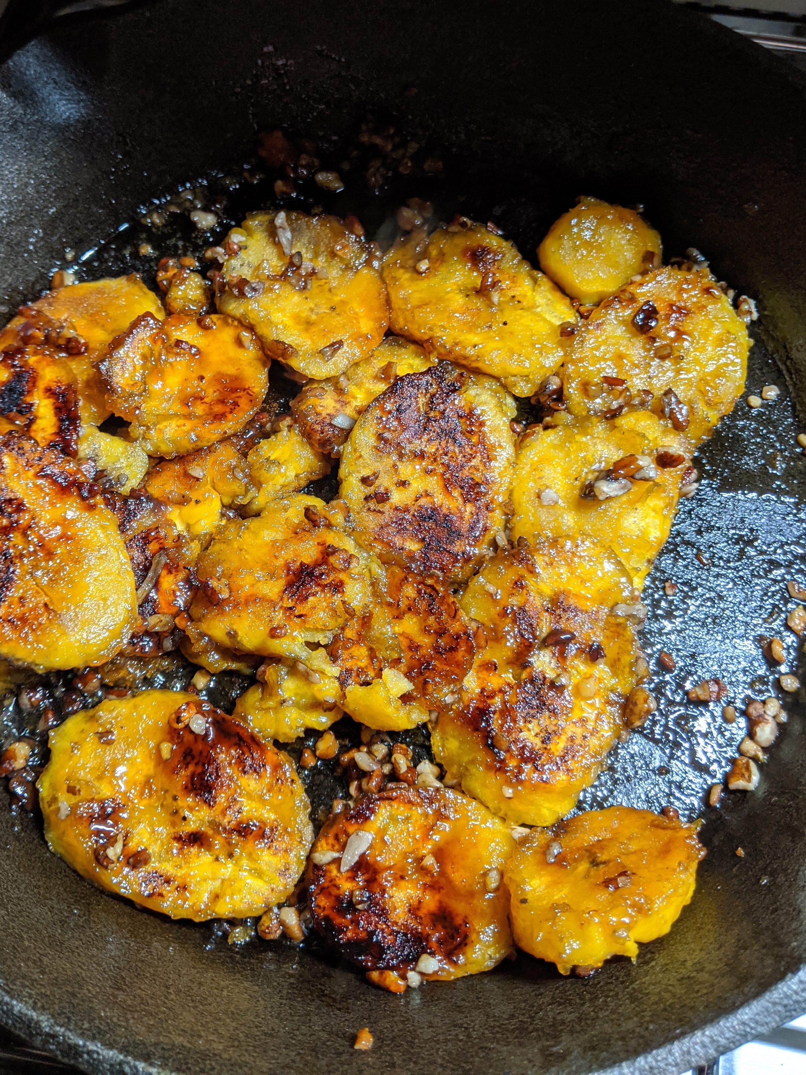 Note: We had these in Belize as well as at a Cuban place in Key West and I’m still working on this recipe. You want to wait until the plantains are softer to the touch before peeling and slicing, otherwise they come out with the texture and taste of a potato. I read several recipes claiming you don’t need to add anything to the skillet other than the plantains, but I found that to be hogwash. I also kept greener plantains around, waiting for them to ripen, but they never did. Instead, the broke out in weird brown blotches extending into the fruit and I didn’t trust them.
