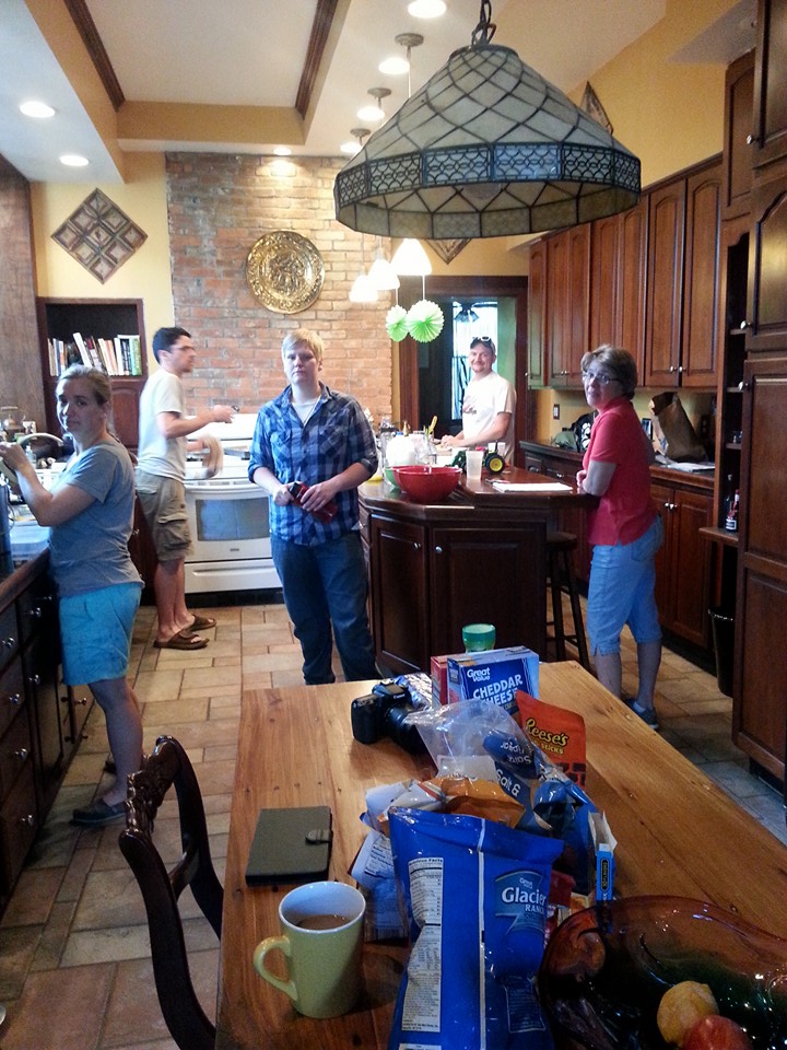- Melt chocolate chips and butter over make-shift double-boiler (plastic mixing bowl over simmering water)